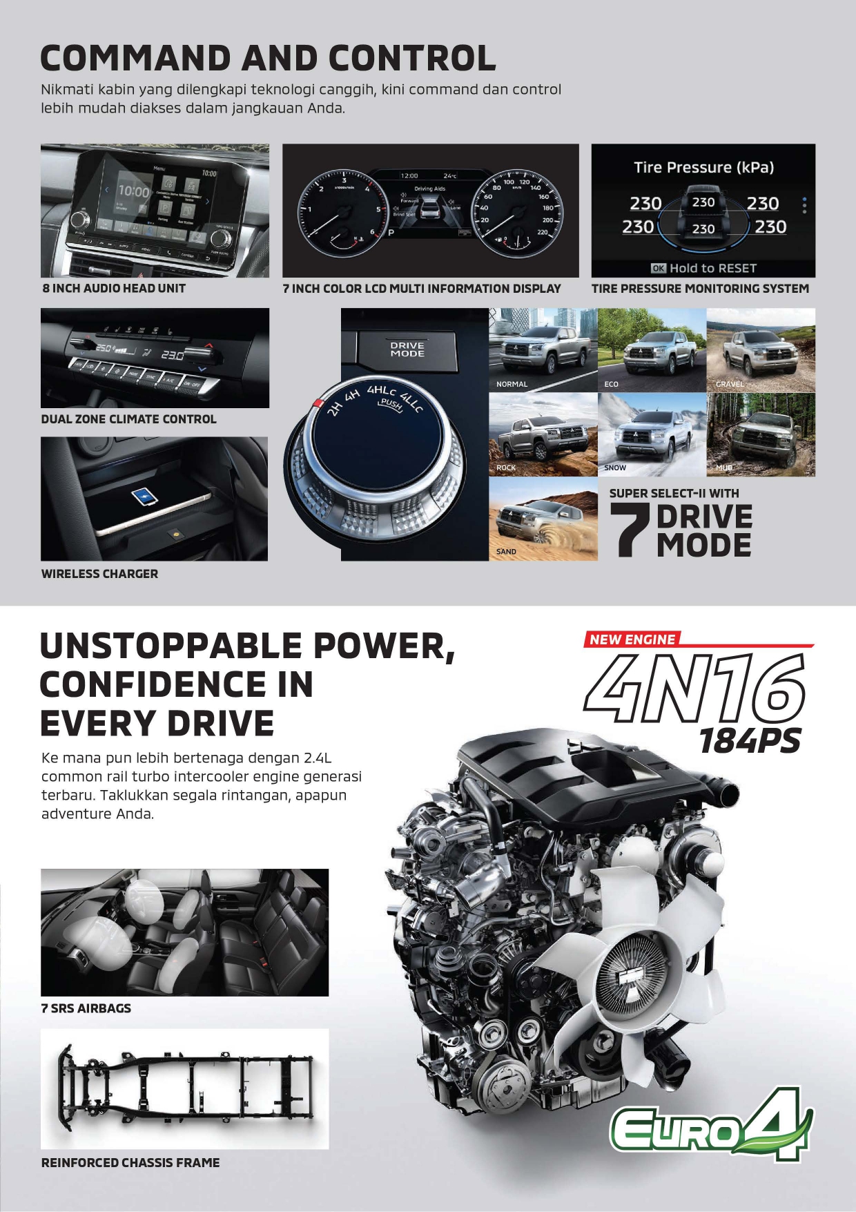 All New TRITON Mesin kuat dan desain sporty, bahkan di medan yang sulit Anda pun masih dapat melewatinya. Setiap kendaraan Mitsubishi All New Triton dilengkapi dengan garansi 3 tahun atau 100.000km (mana yang dicapai terlebih dahulu).